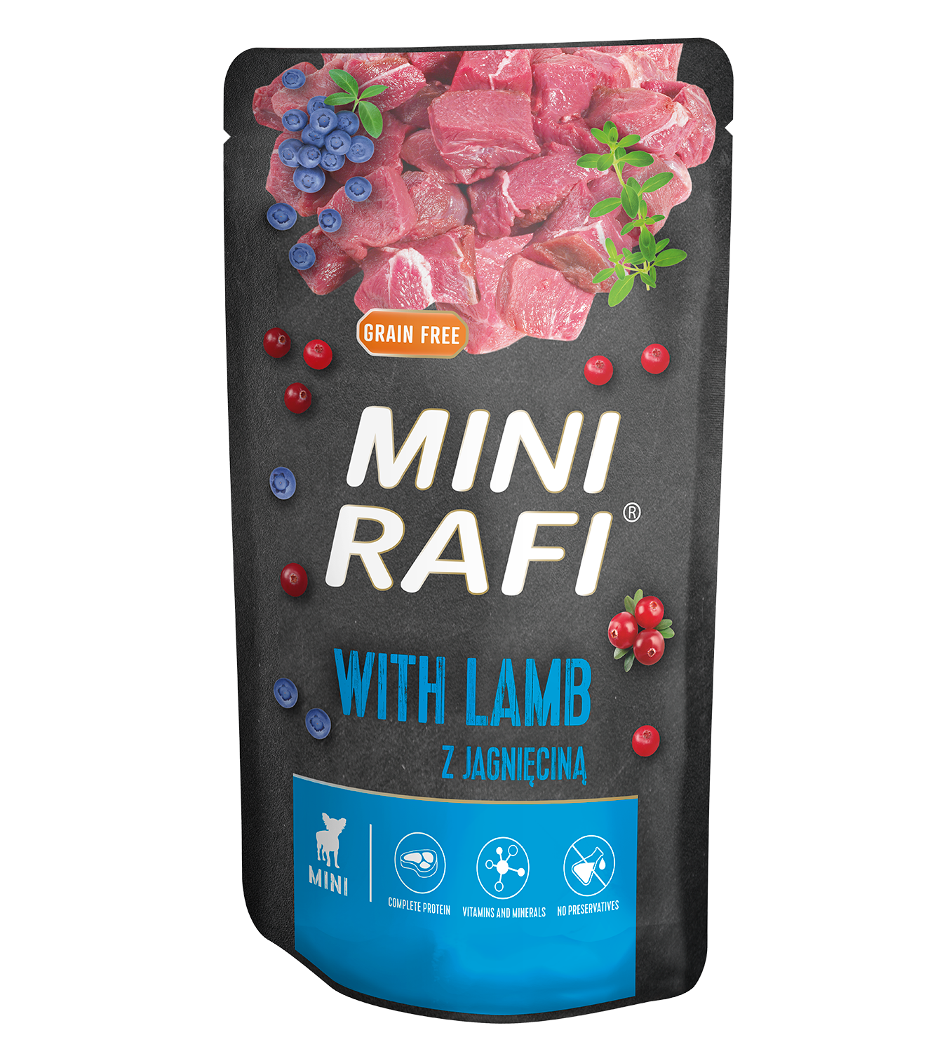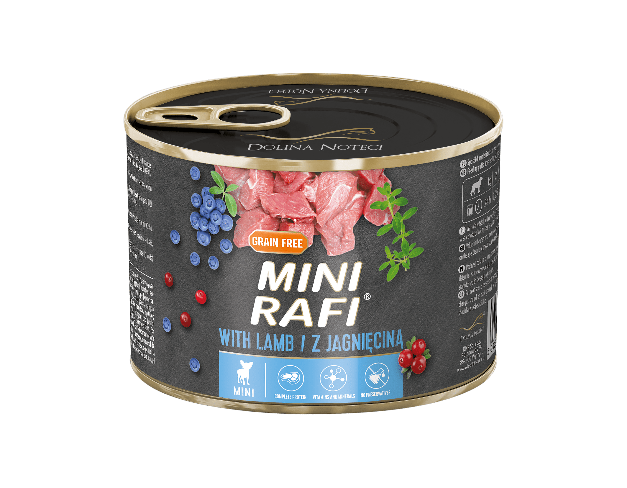 Mini Rafi wet food with lamb makes a complete food for adult small-breed dogs that meets all nutritional demands and requires no additional supplementation. It contains valuable nutrients derived from raw materials of animal origin. The food has been adapted to the specific nutritional requirements.