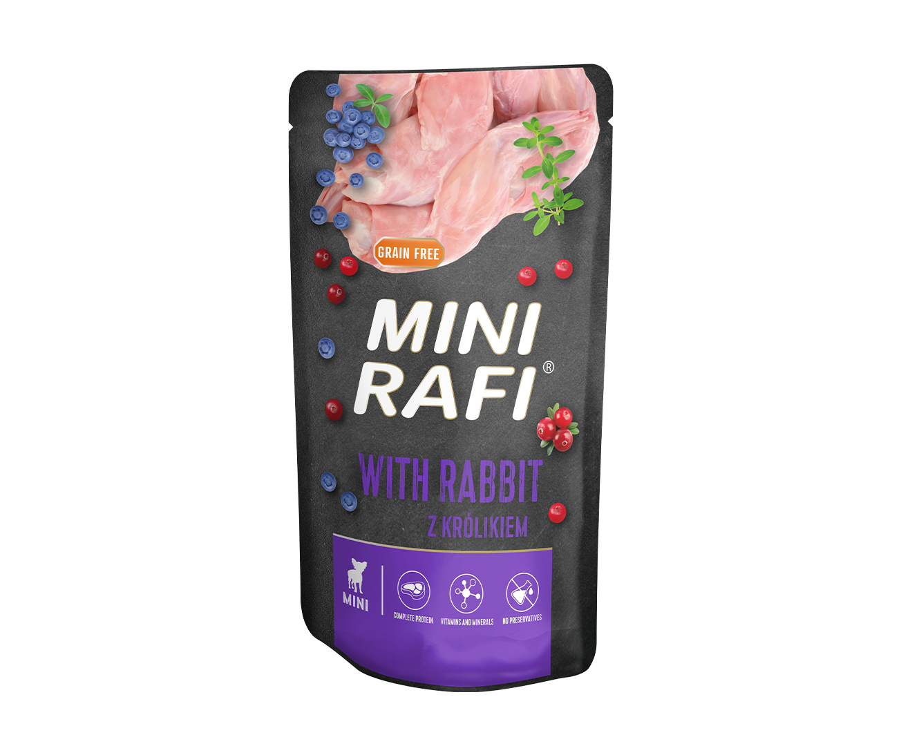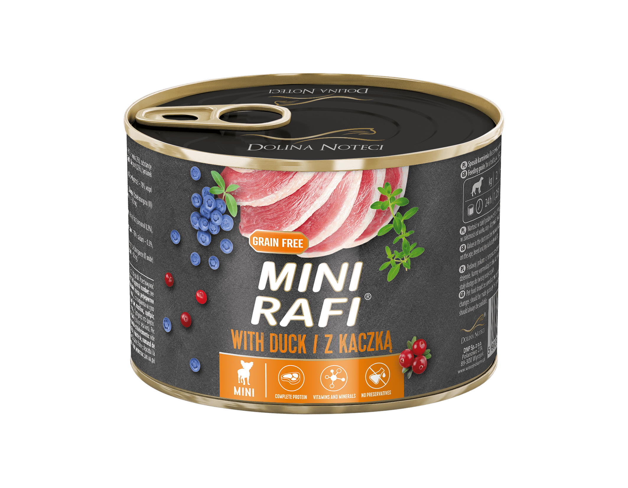 A complete meal for adult small breed dogs with valuable nutrients from raw materials of animal origin. The pet food recipe has been developed to meet all standards for the specific nutritional requirements of adult small breed dogs. To provide the animal’s body with adequate levels of protein and fatty acids, these must be assimilated from the food. A natural source of n-3 fatty acids is salmon oil, which, when added as an ingredient to pet food along with blueberries and cranberries, has a beneficial effect on the metabolism of adult dogs. The addition of herbs such as thyme improves the digestive function of the delicate digestive tract of adult small breed dogs. The meat content of the food – 65% – including lamb, provides the right amount of protein and fatty acids for your dog’s digestive system. Eating duck meat supports the functioning of the nervous system, and dogs who regularly eat duck enjoy better reflexes and have no problems falling asleep. Thanks to its calcium and phosphorus content, this meat strengthens their teeth and bones and protects against osteoporosis. Thanks to its iron content, it also protects against anemia and supports the proper functioning of the immune system. Mini Rafi food is the ideal and healthy choice for a well-balanced, varied diet – for the health and proper nutrition of your dog.