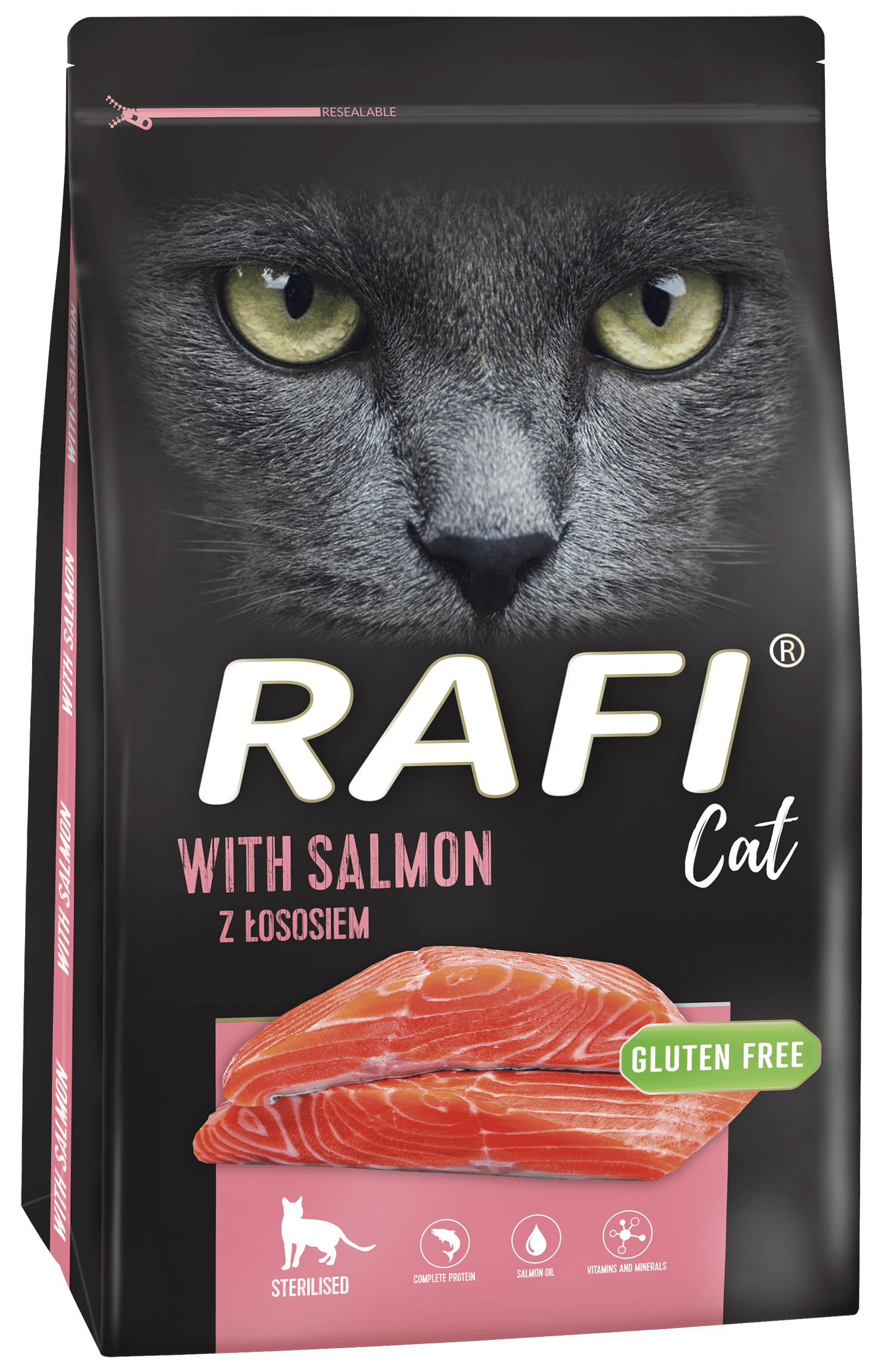 Sterilized cats require a diet tailored to their needs. Rafi Cat dry cat food with salmon contains specially selected ingredients, chosen in proportions that promote good condition and health in sterilized pets. Salmon and animal products provide a high protein and fat content which makes the nutrients more easily digestible. The added salmon oil is an excellent source of n-3 and n-6 fatty acids. Optimal levels of vitamins, and minerals, as well as prebiotic ingredients, help to improve digestive function, intestinal peristalsis, and immunity. Vitamin A contributes to normal vision, E prevents the harmful effects of free radicals and D3 is responsible for maintaining healthy teeth and bones. Thanks to the high content of raw fibers, the product has a lower energy value and meets the nutritional needs of cats after sterilization, and is at risk of becoming obese or overweight.