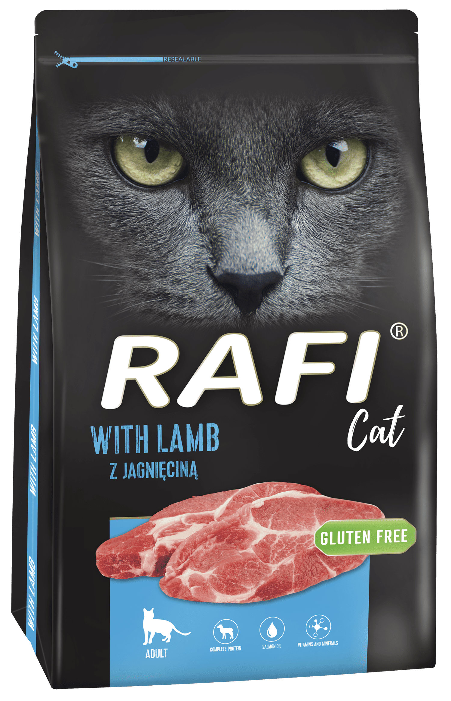 A perfectly balanced diet is essential for the well-being of your pet. Rafi Cat dry pet food with lamb covers the daily requirement for all nutrients. The correct selection of raw materials and top-quality lamb meat guarantee your pet a high content of easily digestible protein and fat. The addition of salmon oil provides n-3 and n-6 fatty acids, yeast is an excellent source of prebiotic ingredients, which helps to maintain a healthy digestive tract. Vitamins A, E, and D3 have a positive effect on immunity, the bone structure and teeth. In turn, the minerals contained in the product – zinc, manganese, iron, iodine and copper care of the condition of the skin and coat, are responsible for correct metabolism and block the negative impact of free radicals. The addition of taurine, which is essential in the cat’s diet, supports the work of the entire organism.