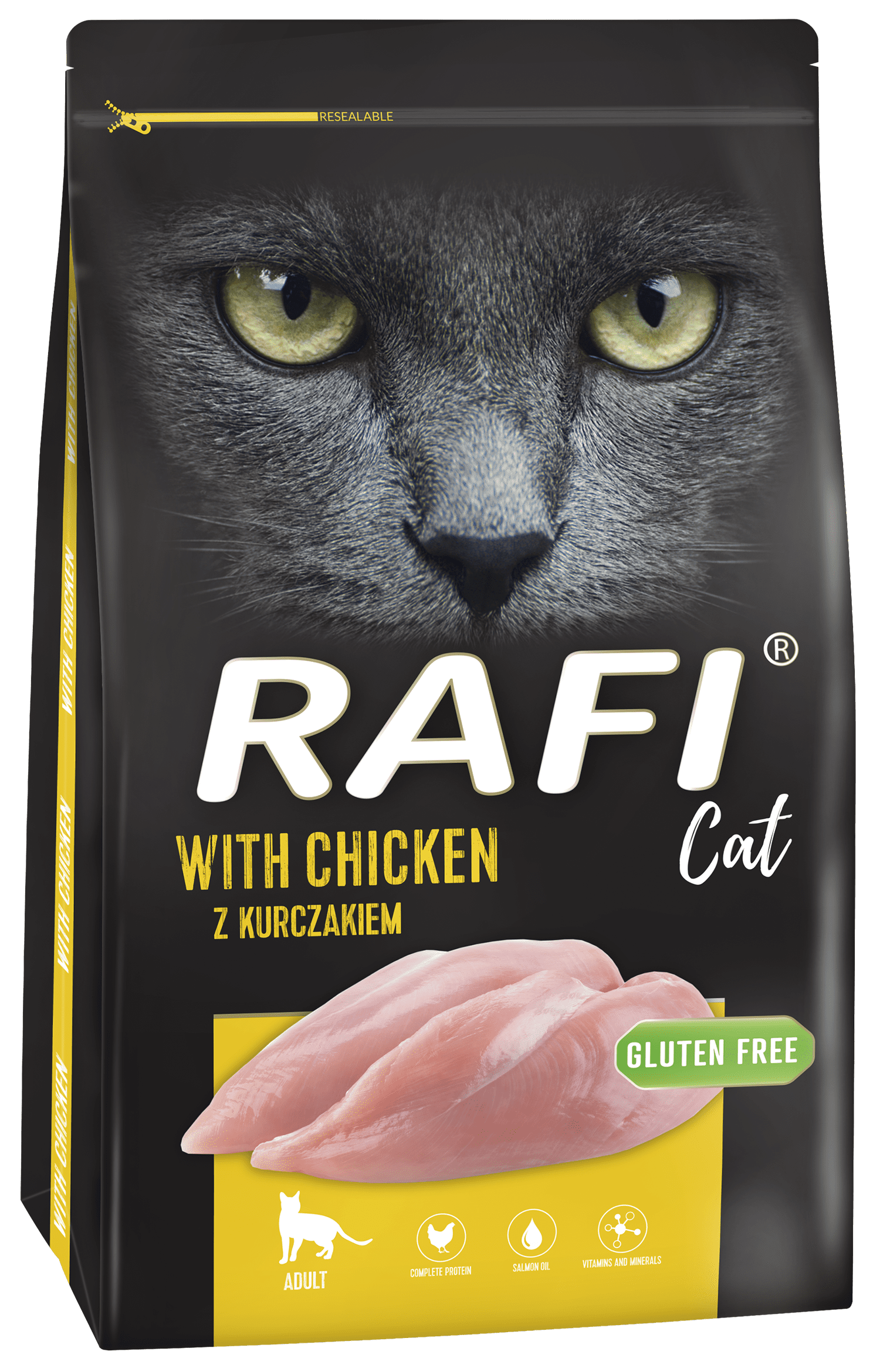 Rafi Cat dry cat food with chicken is a complete meal for cats of all breeds. The highest quality raw materials used in the production process provide your pet with essential vitamins and minerals. Chicken meat and products are a rich source of easily digestible protein and fat. Salmon oil provides natural n-6 and n-3 fatty acids. Taurine, which is essential for cats, is responsible for the proper functioning of the entire organism. In turn, the addition of yeast provides supplementation of vitamins A, E, and D3, as well as the minerals zinc, manganese, iron, copper and iodine. The formula composed in this way supports immunity, has a positive effect on teeth, bones, coat, and metabolism. In addition, it inhibits the negative effects of free radicals and allows to stay fit and healthy.