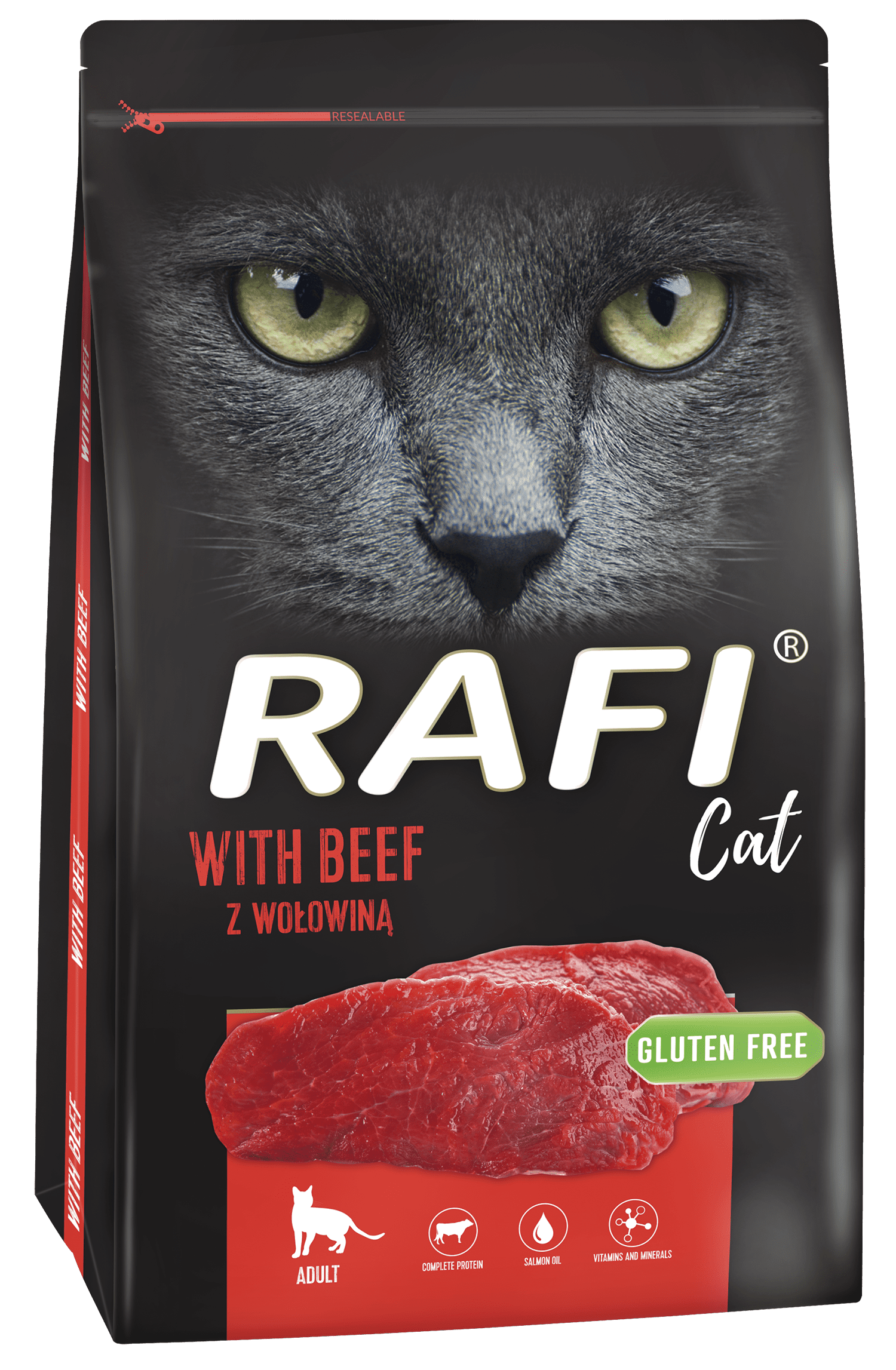 Beef is an excellent source of taurine, which is essential in a cat’s diet. This is why Rafi Cat dry cat food contains beef of the highest quality. The product is rich in easily digestible proteins and fats which facilitate the absorption of high-calorie meal components into the body. This complete pet food completely covers your pet’s requirements for all nutrients. Salmon oil added to the recipe is a source of n-3 and n-6 fatty acids, while yeast provides vitamins, minerals, and probiotic ingredients. Vitamins A, E and D3 maintain good skin and coat condition, support immunity and have a positive effect on teeth and bones. Zinc and manganese also have a beneficial effect on the skin and coat, while iron reduces the risk of anemia and iodine has a metabolic regulating effect. Rafi Cat food is not only rich in valuable ingredients it is above all a delicious meal that many cats will enjoy.