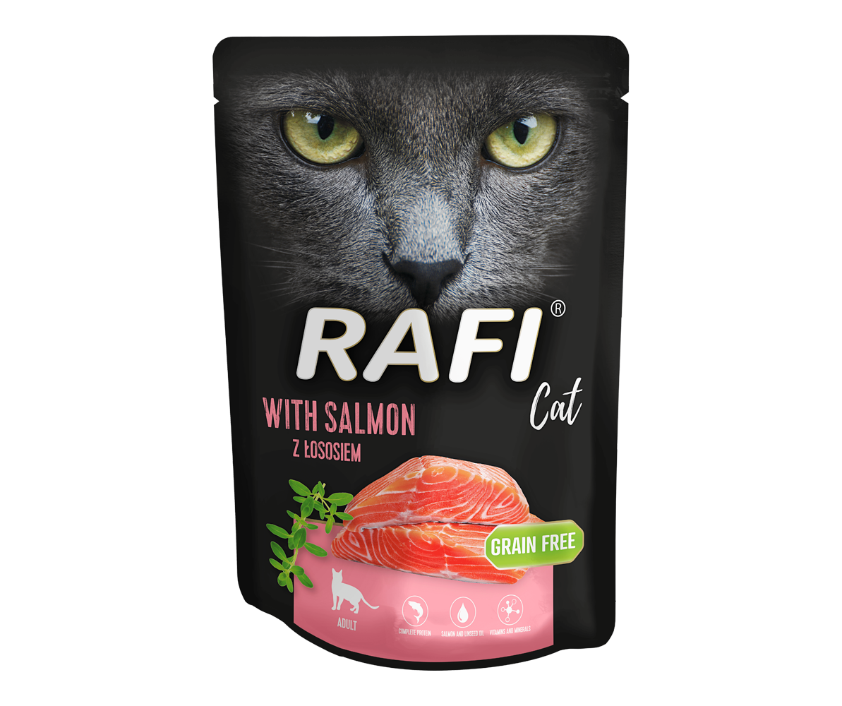 Rafi Cat with salmon is a complete, balanced wet food formulated to support optimal body condition and everyday wellbeing. With a high content of animal-derived ingredients, including salmon, it provides high-quality, easily digestible protein and valuable nutrients such as essential amino acids (including leucine and lysine) as well as selenium, which contributes to normal immune function.
