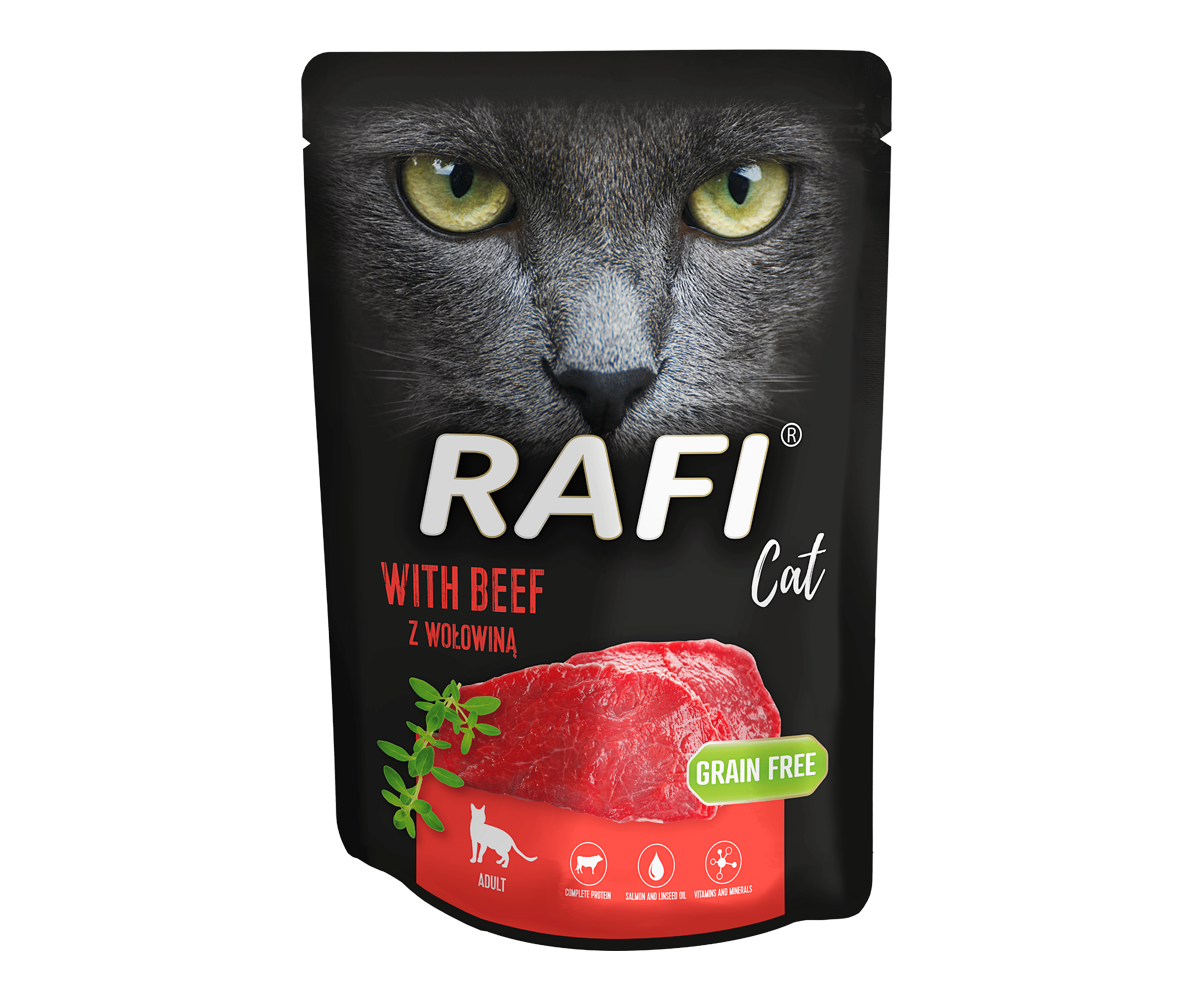 Rafi Cat food is a complete product composed appropriately to meet all the specific nutritional requirements of cats – carnivores. The most important advantage of the food is its high content of meat and products of animal origin, which are a valuable source of complete protein. They also provide fat and arachidonic acid, essential for the cat’s proper functioning. Additionally, meat and products of animal origin, linseed oil, salmon oil, balance the cat’s diet with polyunsaturated fatty acids, both of n-3 and n-6 family. The addition of taurine to the cat food meets the necessary requirement covering the cat’s need for this amino acid, thus ensuring proper digestion of fats and proteins. The correct ratio of calcium to phosphorus contributes to maintaining homeostasis of these elements in the body and bone mineralisation at a constant level. Iodine ensures correct metabolic processes of all nutrients.