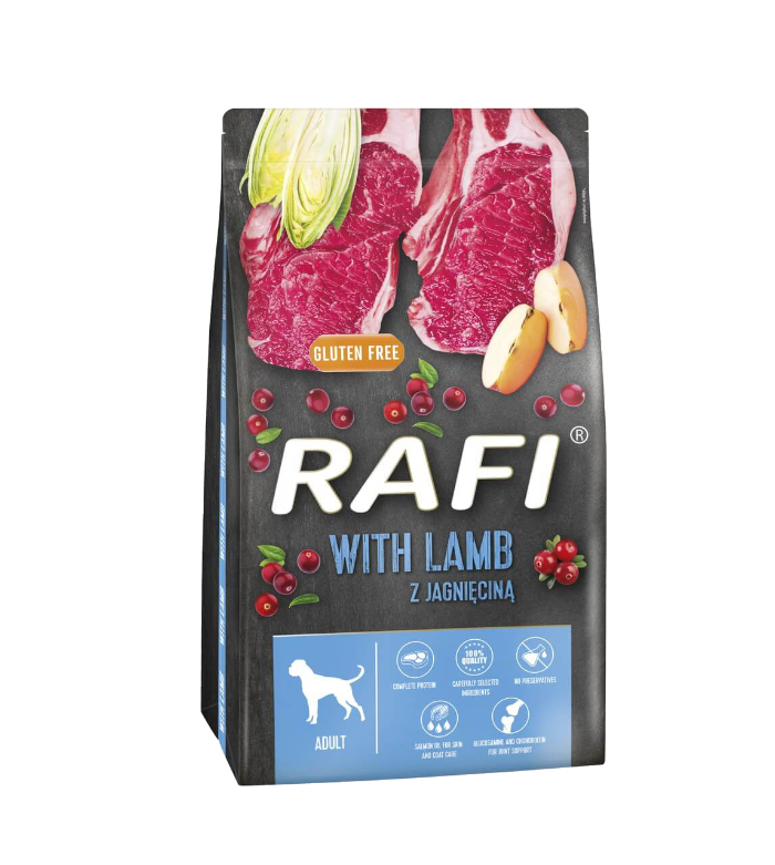 Are you searching for a product to add variety to your pet’s daily diet? If so, you have come to the right place. This is our new Rafi dry food with lamb. It is a product full of valuable nutrients, minerals and vitamins necessary to maintain health and good condition of an adult dog. The high-quality raw materials of animal origin are a source of wholesome protein, along with essential amino acids and valuable n-3 and n-6 fatty acids. Their appropriate distribution is also ensured by addition of salmon oil. Chondroitin sulphate and glucosamine protect the dog’s joints by improving their shock absorption and increasing the elasticity of connective tissue. Prebiotic ingredients such as fructo-oligo-saccharides, inulin and mannano-oligo-saccharides, which stimulate the multiplication of beneficial intestinal bacteria and help to support the dog’s natural immune system, have a significant impact on the proper functioning of the digestive tract.