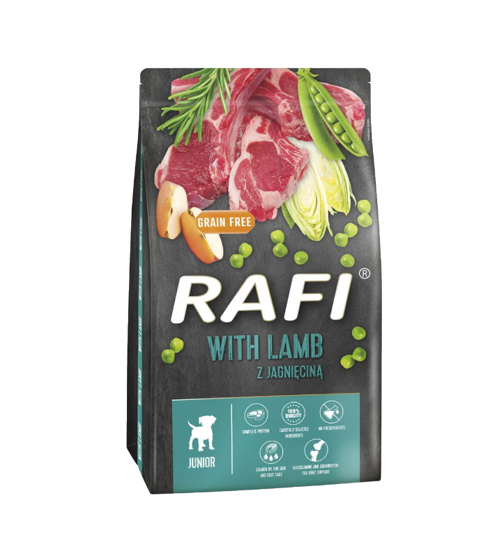 Are you wondering which products you should use to enrich the daily diet of puppies and young dogs? Rafi dry food with lamb makes a perfect solution. This complete meal is balanced in terms of essential nutrients, vitamins and minerals for the proper growth of puppies and young dogs. Salmon oil and the addition of linseed ensure the right amount of n-3 and n-6 fatty acids, which are particularly important in the early stages of development of a young dog. In turn, the right calcium/phosphorus ratio has a positive effect on the functioning of the skeletal system. Chondroprotective substances, i.e. chondroitin sulphate and glucosamine, have the task of stabilising the development of cartilage tissue and thus ensuring proper joint mobility in adult life. The enrichment of Rafi dry food with prebiotic ingredients – including fructooligosaccharides, inulin and mannanoligosaccharides – contributes to maintaining the balance of intestinal microflora in the gastrointestinal tract, which in turn has an effect on many vital functions in a young dog.