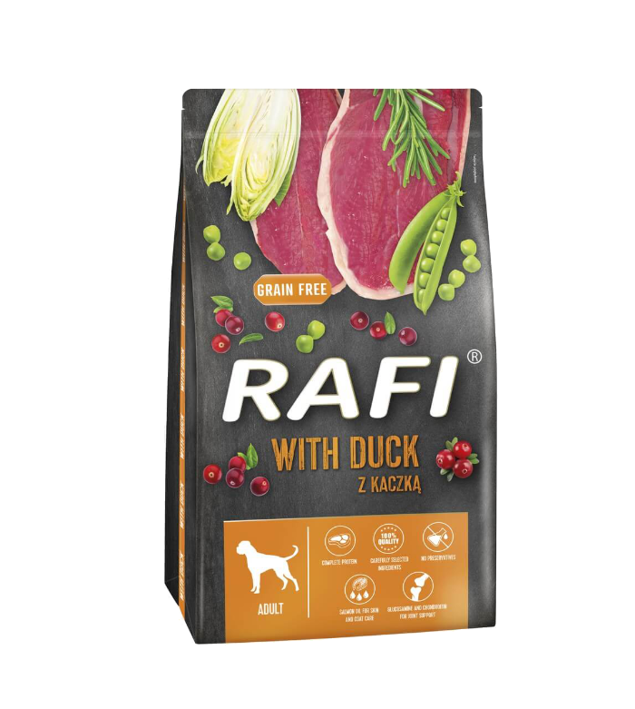 A unique taste, a variety of valuable additives, high levels of complete protein and essential fatty acids – this is Rafi Dry Duck Dog Food. Its recipe has been composed to cover the demand for all essential nutrients, minerals and vitamins. As a result, it ensures that the body functions properly and maintains the good condition and health of an adult dog. Duck is a raw material particularly rich in easily digestible protein with a high content of essential amino acids and fat rich in polyunsaturated fatty acids. Inclusion of both salmon oil and linseed ensures correct proportions of n-3 and n-6 fatty acids, which reduce the risk of inflammatory reactions. Glucosamine and chondroitin sulphate, chondroprotective substances, improve shock absorption of joints, reducing pain in osteoarthritis. Nutritional value and energy density of Rafi with duck guarantee a smooth and efficient intestinal passage, during which nutrients are slowly released and effectively absorbed. The addition of fruit and vegetables – cranberries, sweet potatoes, peas and carrots – increases palatability of the dry food and its sensory appeal.