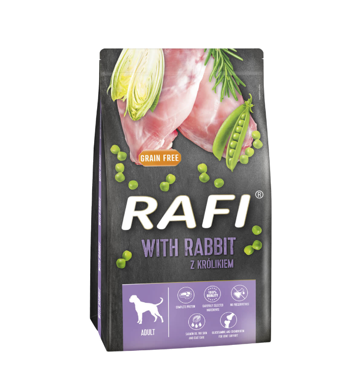 If dry food is your dog’s favourite treat, give them the new Rafi food with rabbit. Its recipe takes into account the need for all the nutrients necessary to maintain the health and good condition of an adult dog. Raw materials of animal origin are a source of high-quality complete protein, fat, as well as all essential minerals and vitamins. Rabbit is a raw material particularly rich in easily digestible protein with a high content of essential amino acids. Salmon oil and linseed ensure the correct proportion of n-3 and n-6 fatty acids. Chondroproteins – glucosamine and chondroitin sulphate – improve joint mobility and protect against changes in joint cartilage. The provision of ingredients with prebiotic properties (fructooligosaccharides, including inulin and mannanoligosaccharides) contributes to maintaining a balance in the digestive tract, which in turn affects many vital functions of an adult dog.