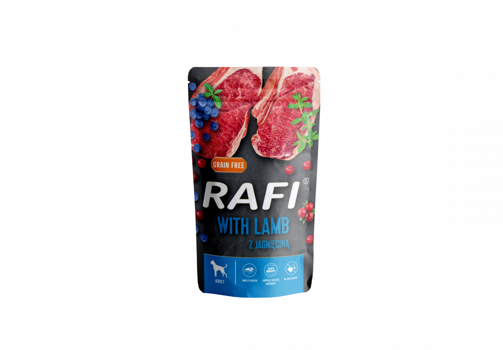 Wet Rafi with lamb is an easily digestible product for daily feeding of adult dogs. Meat and raw ingredients from lamb are a valuable source of the amino acids methionine, isoleucine and cystine. It also contains complete protein, B vitamins and many valuable micro- and macroelements essential for proper functioning of pet’s body. Fatty acids from the n-3 and n-6 family are responsible for supporting natural immunity. They also participate in regulating metabolic processes and have a moisturizing function – they have a beneficial effect on the condition of skin and fur. Rafi wet food contains an appropriate proportion of selenium and copper. The addition of thyme contributes to the sensory appeal of the product. Blueberries and cranberries, sources of many valuable vitamins and nutrients, increase value of the food.