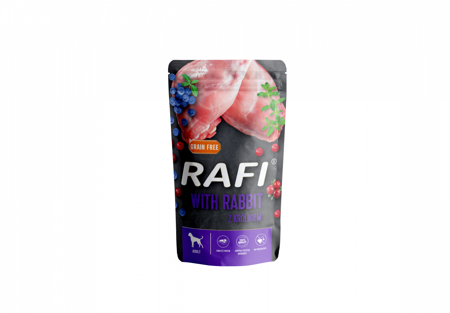 Rafi with rabbit is based on modern standards and recommendations related to proper nutrition of adult dogs. Its composition fully covers the demand for essential nutrients, minerals and vitamins. Meat and raw materials derived from rabbit, in addition to complete protein, are a source of iron, selenium and zinc involved in stimulating the body’s defensive functions. The food contains no added preservatives or colourings to improve taste and stimulate appetite. Inclusion of blueberries, cranberries and thyme naturally enhances the sensory appeal of the dog meal. Addition of linseed oil, rich in n-3 and n-6 fatty acids, vitamin E and substances with anti-inflammatory properties, also provides valuable biologically active compounds – phytosterols, which have a beneficial effect on improving the functioning of the digestive tract.