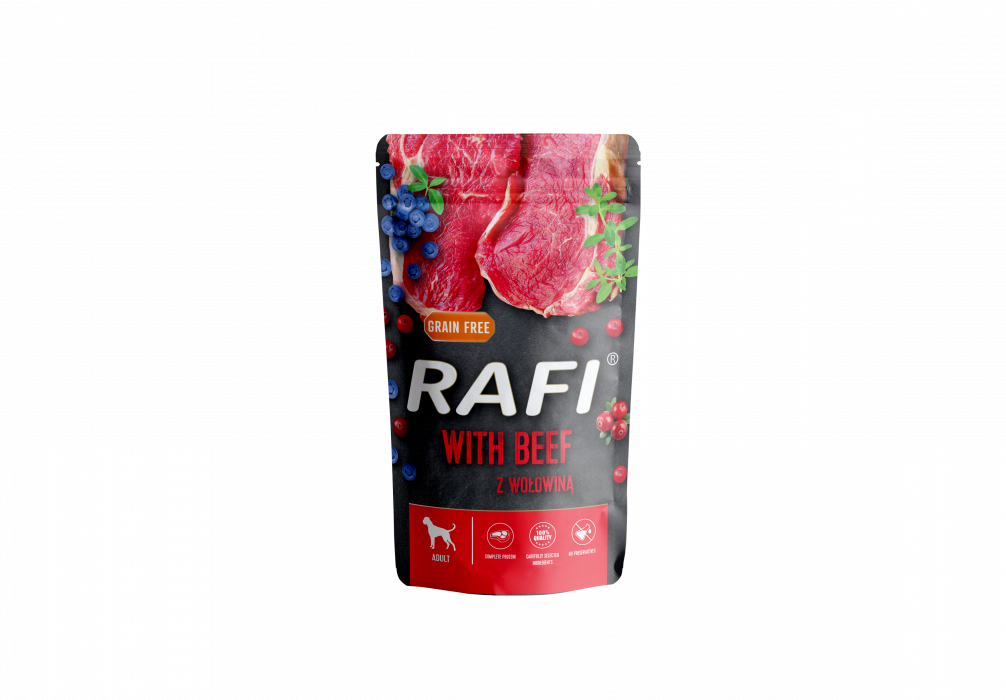 Rafi with beef is a wet food that is rich in complete protein, yet low in fat. Meat and products of animal origin from beef provide the valuable amino acids lysine and histidine. They are also a source of valuable n-3 and n-6 fatty acids, which regulate various vital functions in adult dogs. The formula has been enriched with blueberries and cranberries which, thanks to the bioactive compounds they contain, mainly procyanidins and flavonoids, have strong antioxidant and anti-inflammatory properties. Thyme, in turn, has antibacterial and beneficial effects on digestive functions. Rafi Beef contains iron for normal blood metabolism, as well as selenium and zinc, covering the daily requirement for these nutrients.