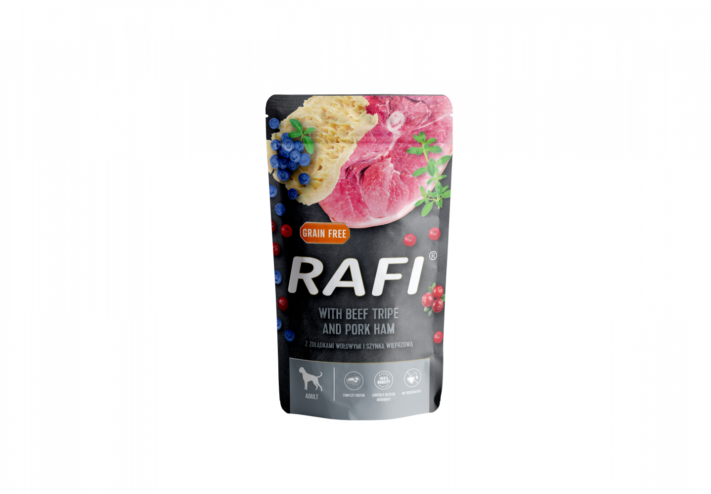 Based on modern standards, the recipe of Rafi wet food with beef tripes and pork ham has been adapted to the nutritional requirements of adult dogs. It is a balanced source of easily digestible and wholesome protein and fat. It contains all necessary minerals and vitamins in quantities that cover daily requirements. Wet food Rafi with beef tripes and pork ham ensures proper mineralization of bones and teeth, as well as proper functioning of all metabolic processes. Added blueberries and cranberries enrich the dog’s diet with a number of valuable biologically active compounds; and thyme increases the palatability of the food.