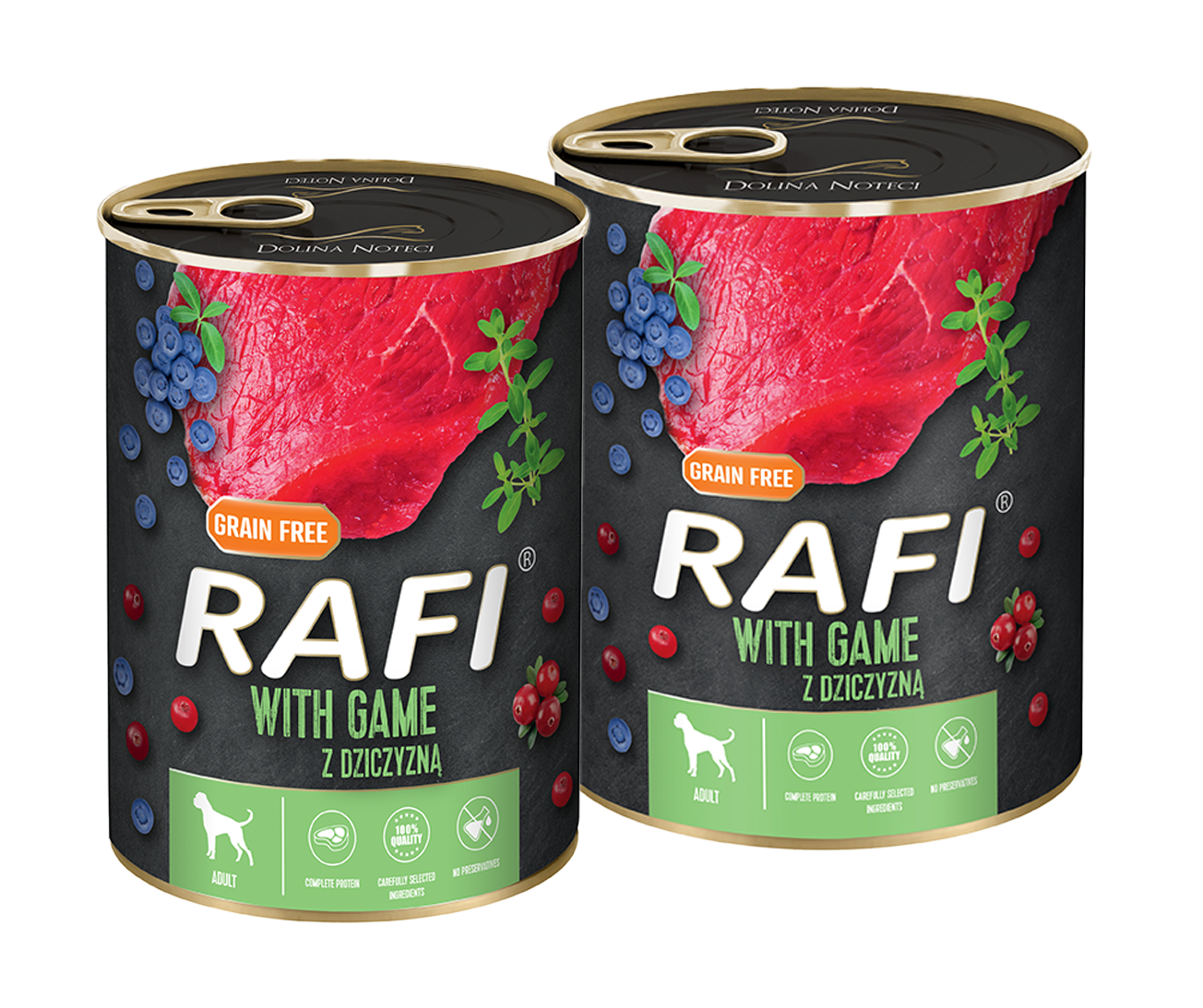 RAFI with game is a source of high-quality protein. The addition of game enriches the food with lysine, leucine, vitamins from the B12 group, and selenium. The remaining animal-derived ingredients ensure the high digestibility of all nutrients, and additionally provide fats with a valuable content of fatty acids. The addition of linseed oil balances the ratio of polyunsaturated fatty acids from the n-3 and n-6 groups and guarantees maintenance of good general condition. The careful selection of ingredients and heat processing of the food makes it tasty for dogs.