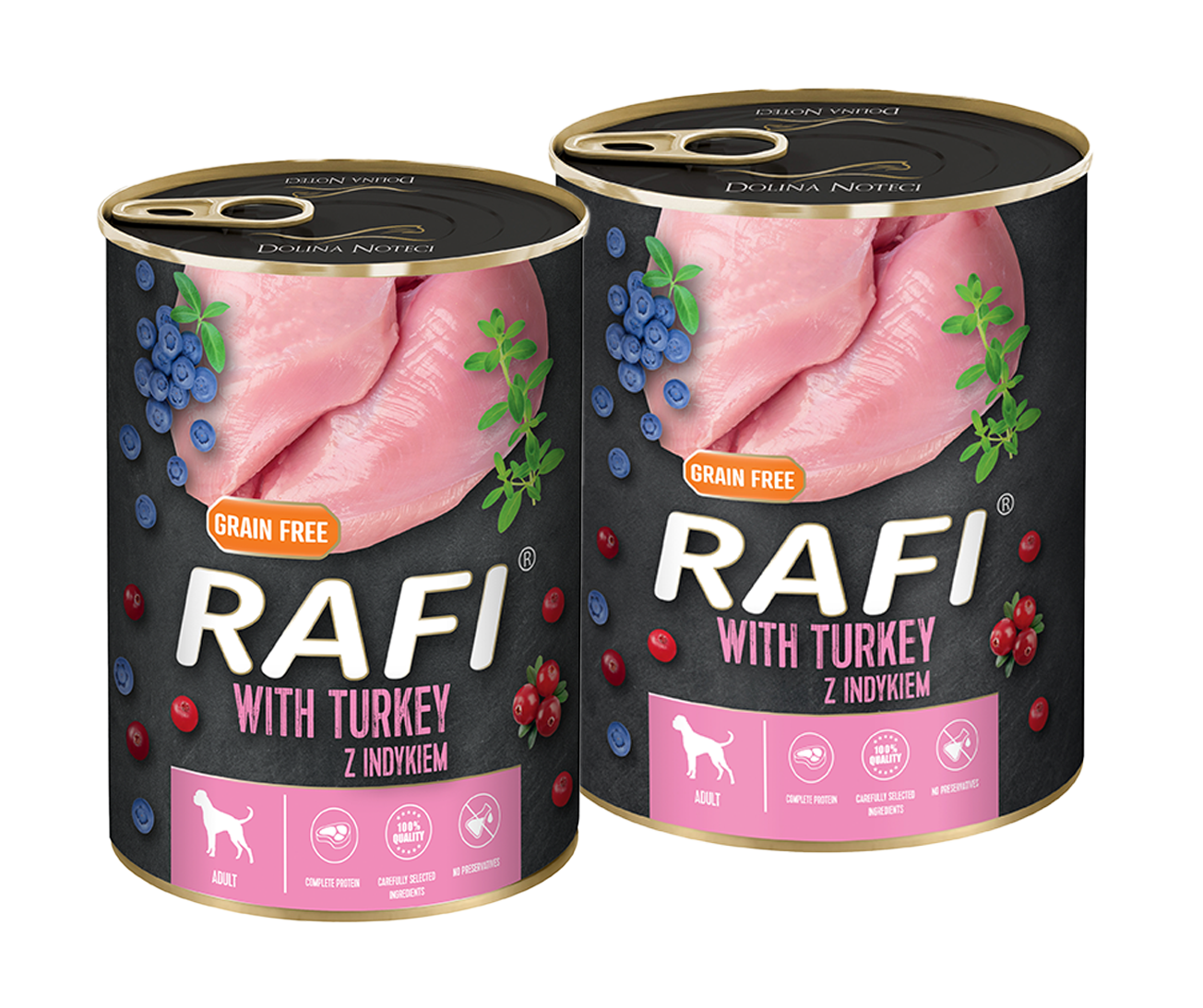 RAFI with turkey is a source of high-quality protein. The addition of turkey hearts enriches the food with methionine, fat-soluble vitamins, and minerals. The remaining animal-derived ingredients ensure the high digestibility of all nutrients, and additionally provide fats with a valuable content of fatty acids. The presence in these fats of fatty acids from the n-6 group make this a useful daily food for dogs, maintain proper skin function and the appearance of the fur. The addition of linseed oil balances the ratio of polyunsaturated fatty acids from the n-3 and n-6 groups and guarantees maintenance of good general condition. The careful selection of ingredients and heat processing of the food makes it tasty for dogs.