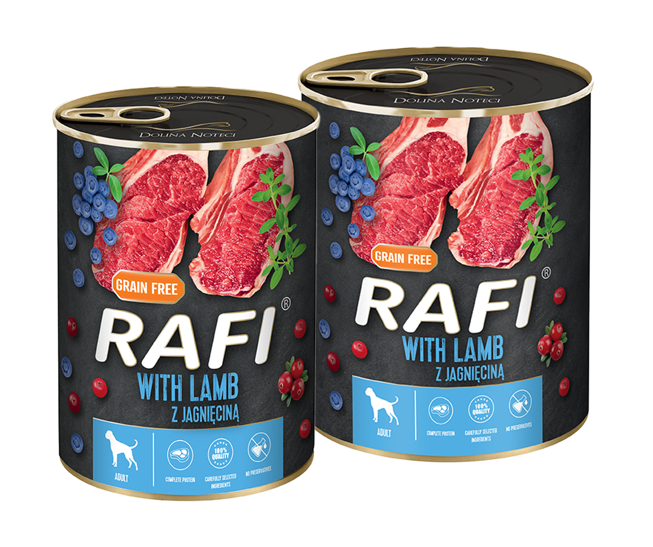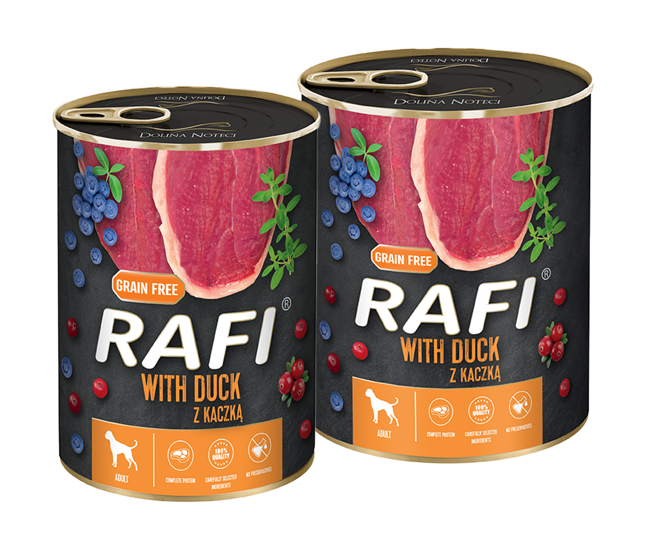 Rafi with duck is a product that is perfectly adapted to the nutritional demands of adult dogs. It contains a high proportion of meat and animal products made of duck. This ensures that wet food provides complete protein which is a source of all vital amino acids. In addition, it is a source of deficient amino acids (especially sulphur), so that these do not need to be supplemented with cereal products. Duck feed contains proper proportions of selenium, copper and iron, thus covering the daily requirement of an adult dog. Particularly important components of duck meat and raw ingredients are n-6 and n-3 fatty acids, which regulate the digestive system. Thyme adds flavour and aroma and supports digestive functions. Blueberries protect against free radicals, and cranberries prevent urinary tract infections.