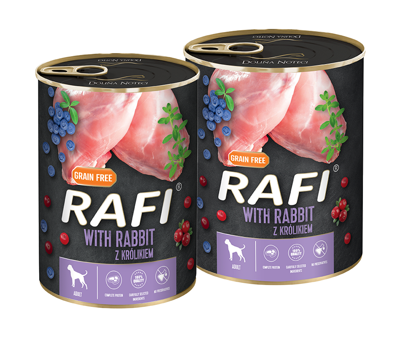 Rafi with rabbit is based on modern standards and recommendations related to proper nutrition of adult dogs. Its composition fully covers the demand for essential nutrients, minerals and vitamins. Meat and raw materials derived from rabbit, in addition to complete protein, are a source of iron, selenium and zinc involved in stimulating the body’s defensive functions. The food contains no added preservatives or colourings to improve taste and stimulate appetite. Inclusion of blueberries, cranberries and thyme naturally enhances the sensory appeal of the dog meal. Addition of linseed oil, rich in n-3 and n-6 fatty acids, vitamin E and substances with anti-inflammatory properties, also provides valuable biologically active compounds – phytosterols, which have a beneficial effect on improving the functioning of the digestive tract.