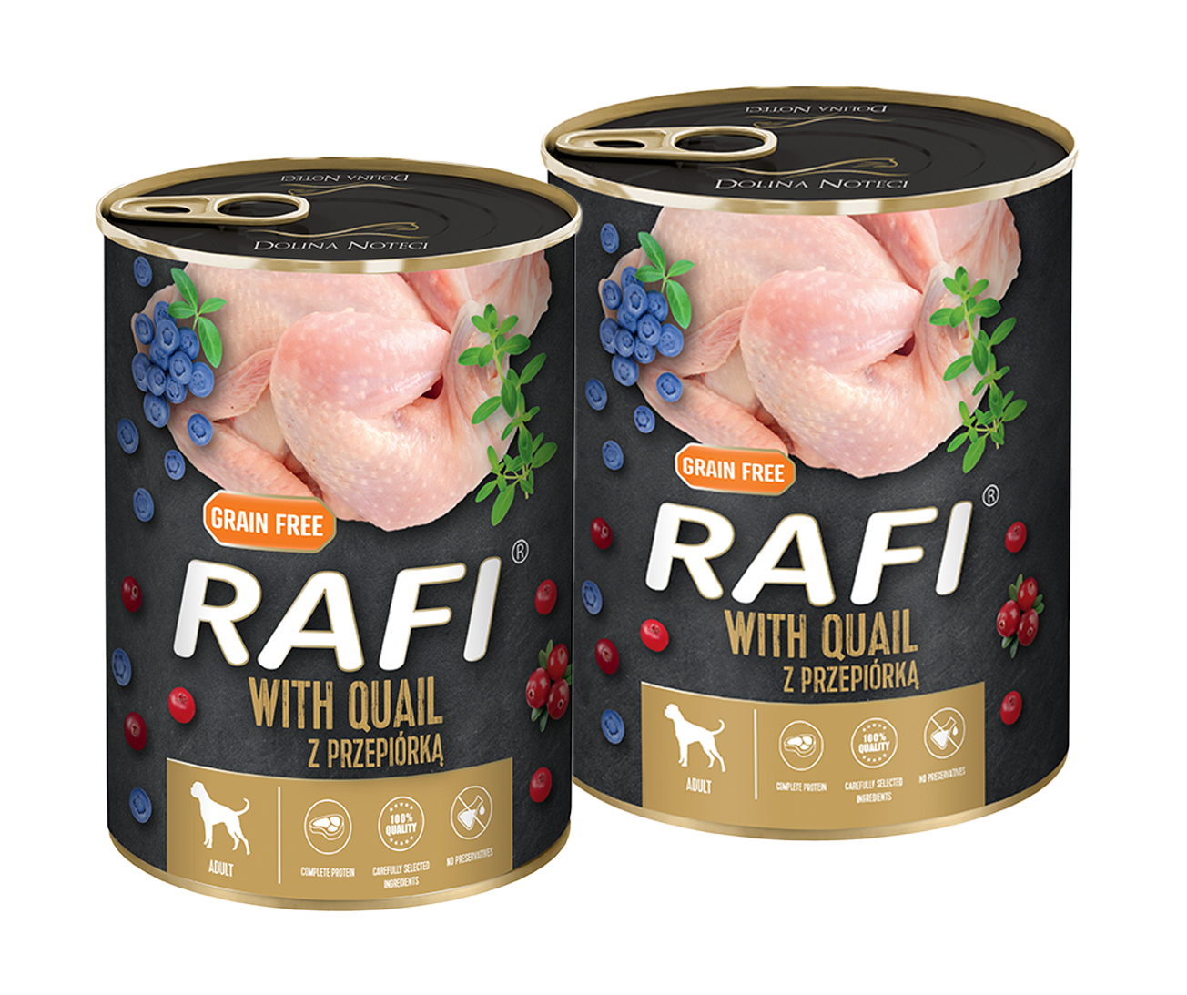 Rafi with quail is a wet food which stands out for its high content of complete protein and the valuable amino acids such as phenylalanine and cystine. The recipe is based on meat and products of animal origin made of quail, thus providing valuable n-6 polyunsaturated fatty acids which regulate a number of functions of the adult dog’s. The food is a source of potassium and copper, which ensure proper functioning of the nervous system. With its contents of oils and biologically active substances, thyme has a relaxing effect on muscles of the digestive tract and stimulates secretion of digestive juices. Furthermore, it increases palatability of the feed. Blueberries and cranberries enrich the composition with a range of vitamins and nutrients.