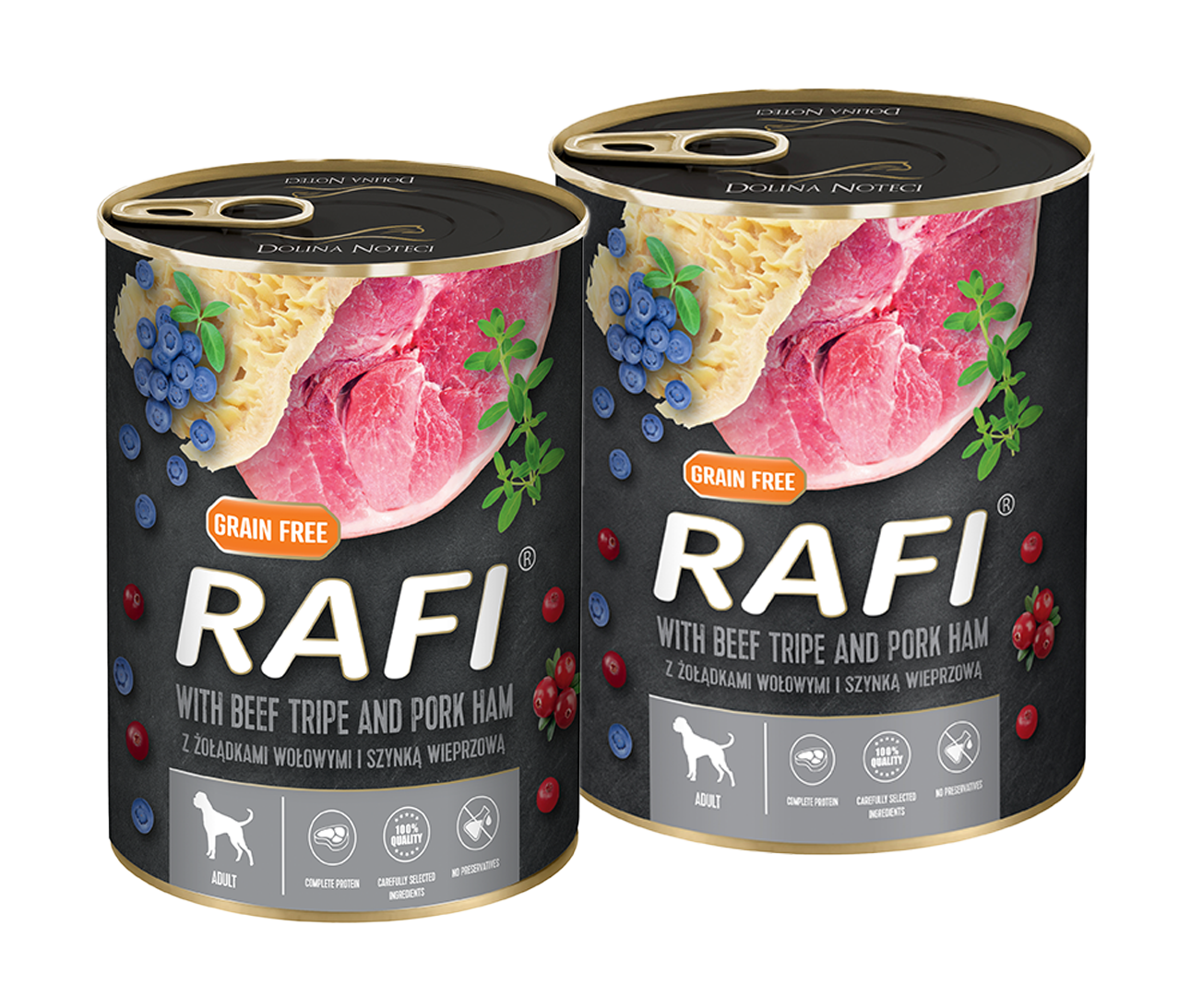 Based on modern standards, the recipe of Rafi wet food with beef tripes and pork ham has been adapted to the nutritional requirements of adult dogs. It is a balanced source of easily digestible and wholesome protein and fat. It contains all necessary minerals and vitamins in quantities that cover daily requirements. Wet food Rafi with beef stomachs tripes and pork ham ensures proper mineralization of bones and teeth, as well as proper functioning of all metabolic processes. Added blueberries and cranberries enrich the dog’s diet with a number of valuable biologically active compounds; and thyme increases the palatability of the food.